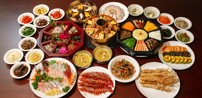 ◆ 食前酒(高麗人参酒・薬酒)・小鉢12品・焼とうふ・イカフエ・水キムチ・チヂム・キムチ・チャップチェ・海鮮鍋・ごはん・デザート(薬茶・薬菓子)